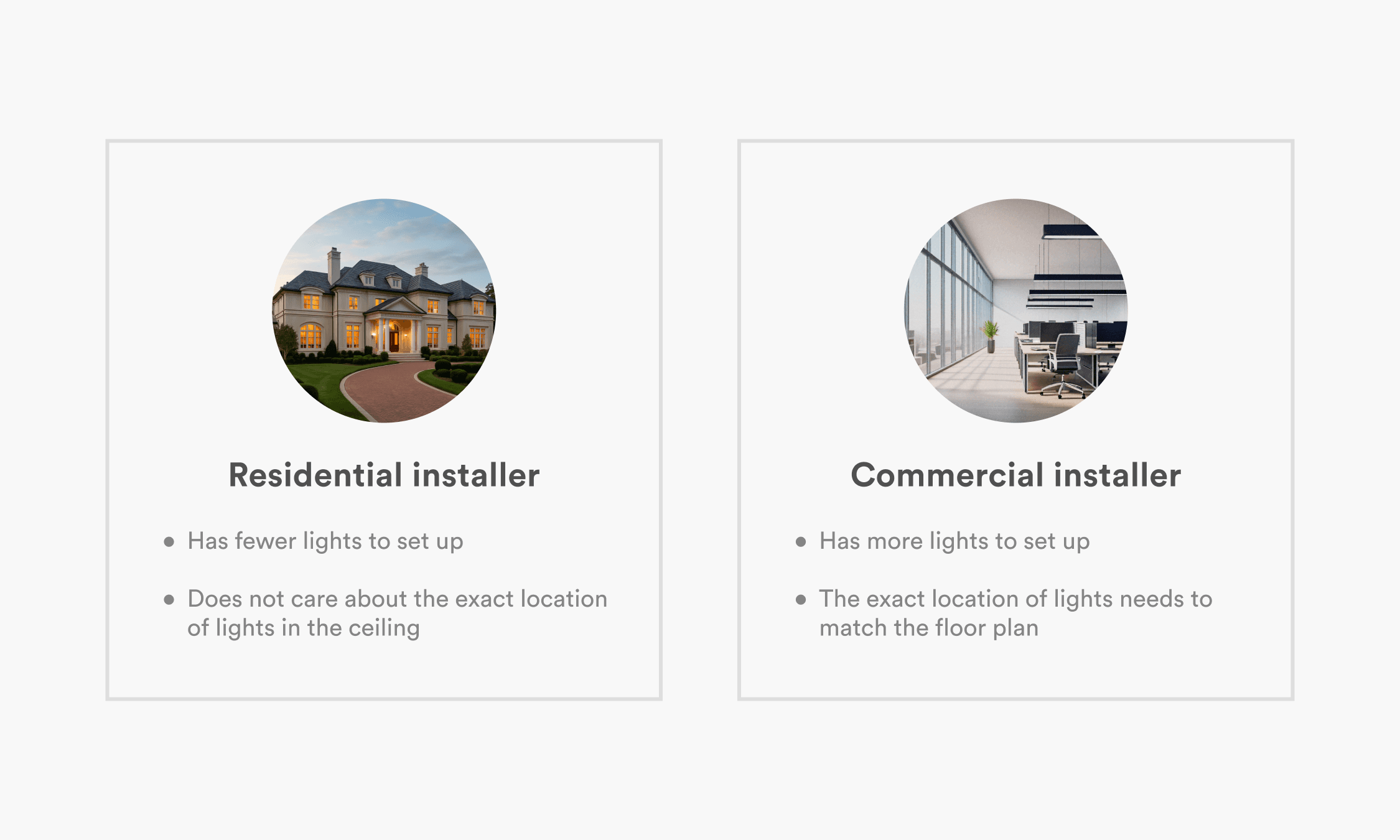 Ketra lights are not just installed by Lutron certified installers in large homes and large offices. Think Bill Gate's holiday home and Apple park. However the needs of residential and commercial installers is different. I started by understanding the needs of all installers by traveling to constructions sites across the US.