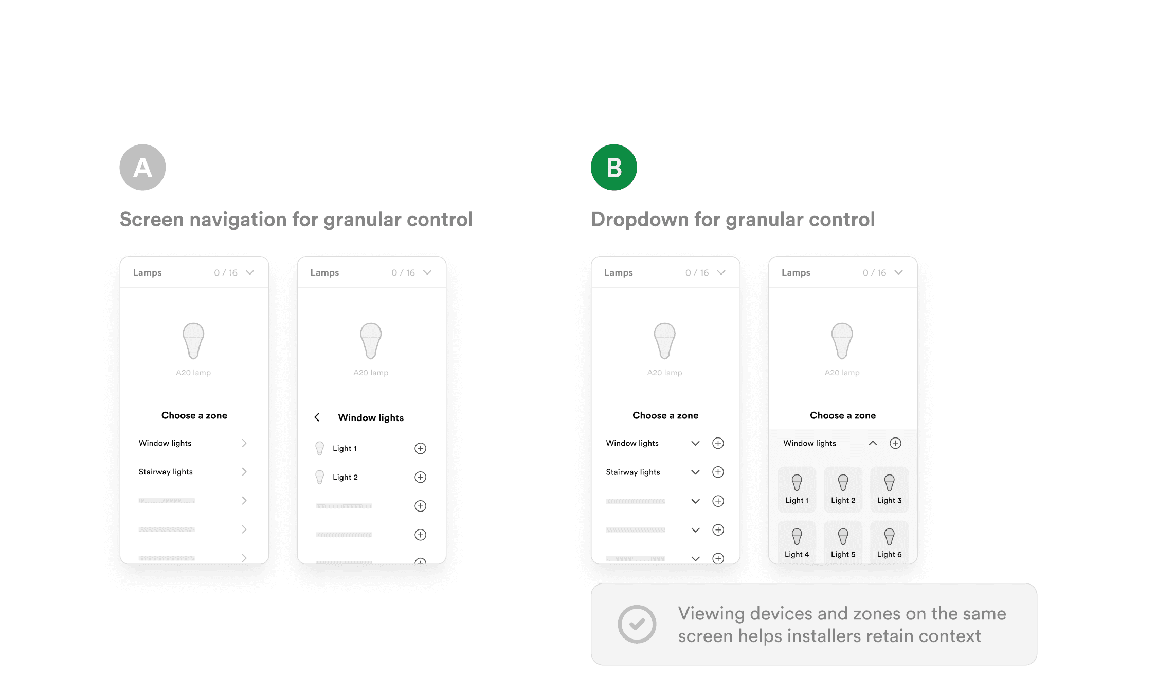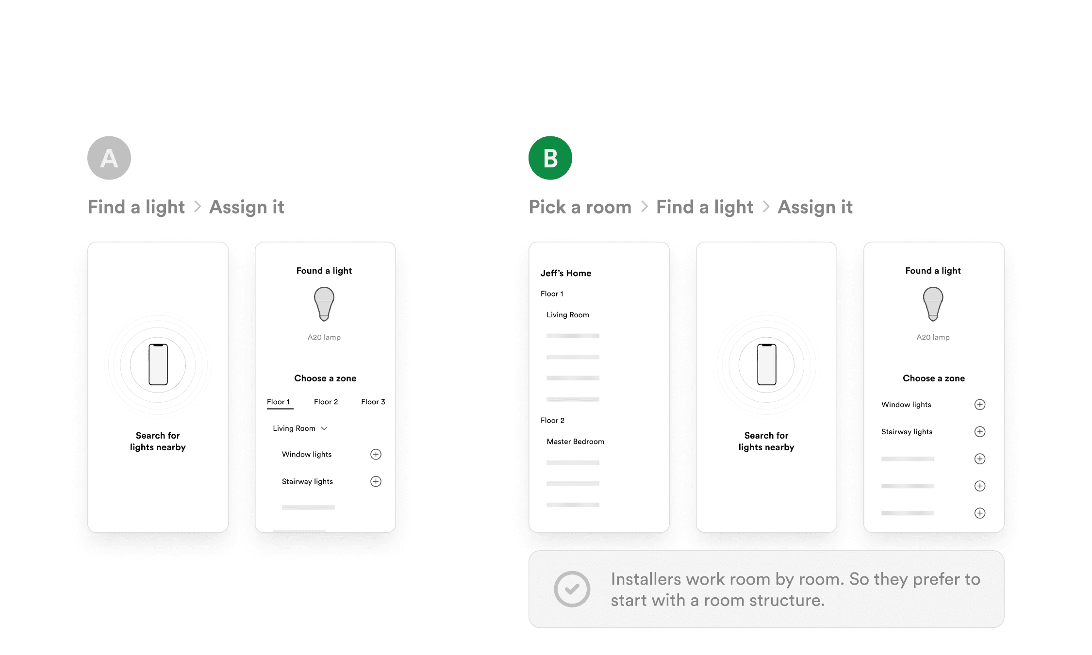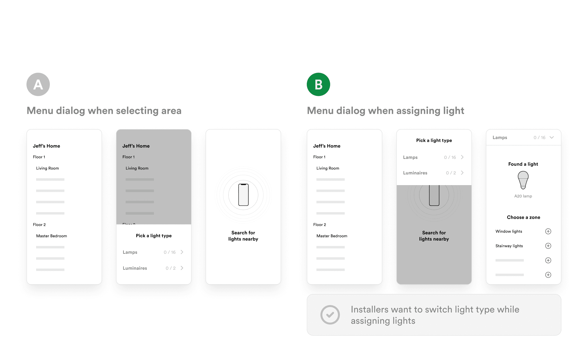 It was imperative that we made the solution mobile-based, to afford portability, and quick, so that an installer can save time. Along with engineering and product teams, I brainstormed different concepts, arriving at key product decisions.